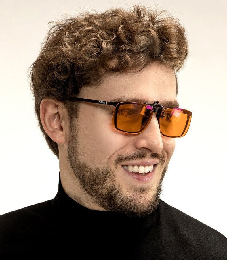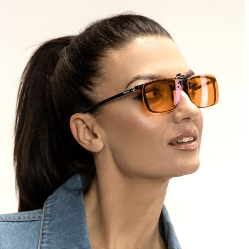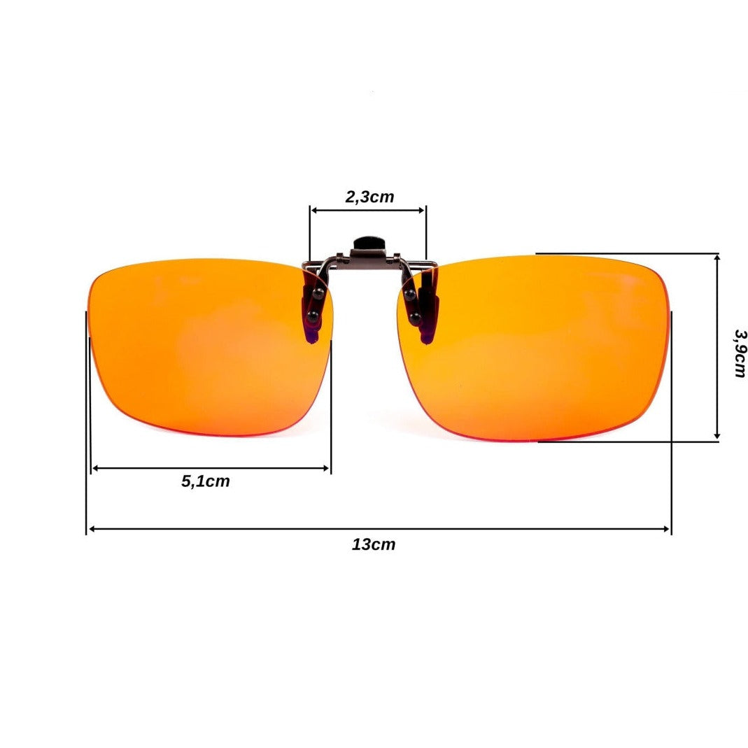 - Gemerkte NoBlue Clip-on Orange met 99% filtratie van blauw licht